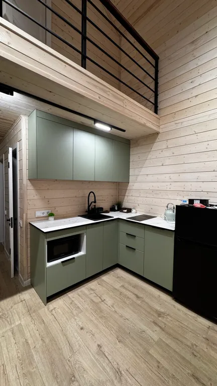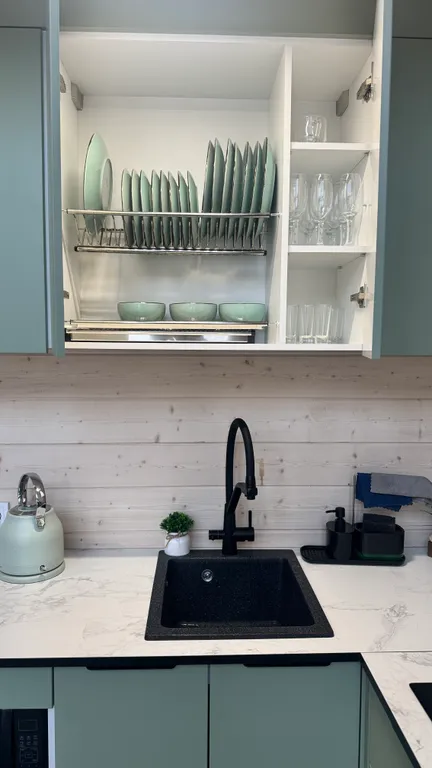 - Полный набор посуды, салатников, кастрюль, стаканов, и всего необходимого для приготовления пищи и комфортного проживания;